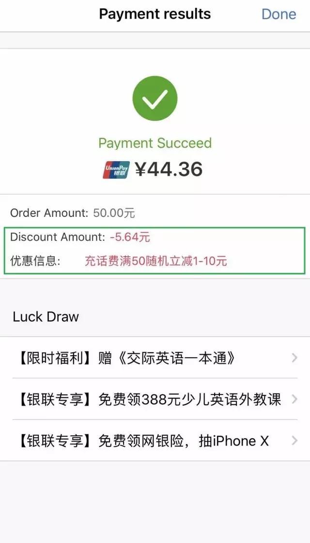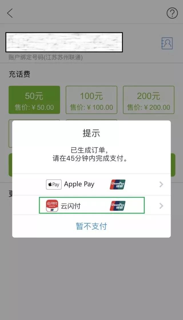 在云闪付APP内进行手机充值时选择【云闪付】付款,,,充值金额(非实付金额)满50元,,,即可享受随机立减1-10元优惠。。活动期间每日限量5万笔,,,单用户每自然月限享受1笔优惠,,,数量有限,,,先到先得。。