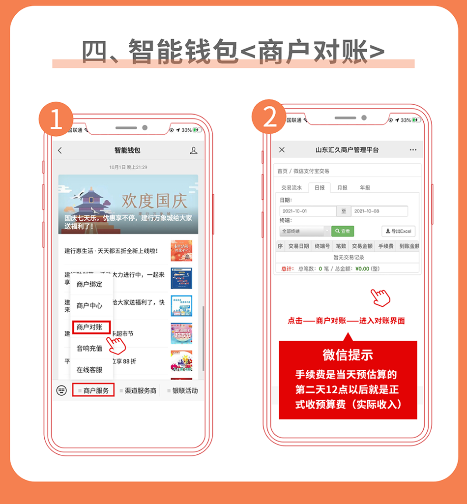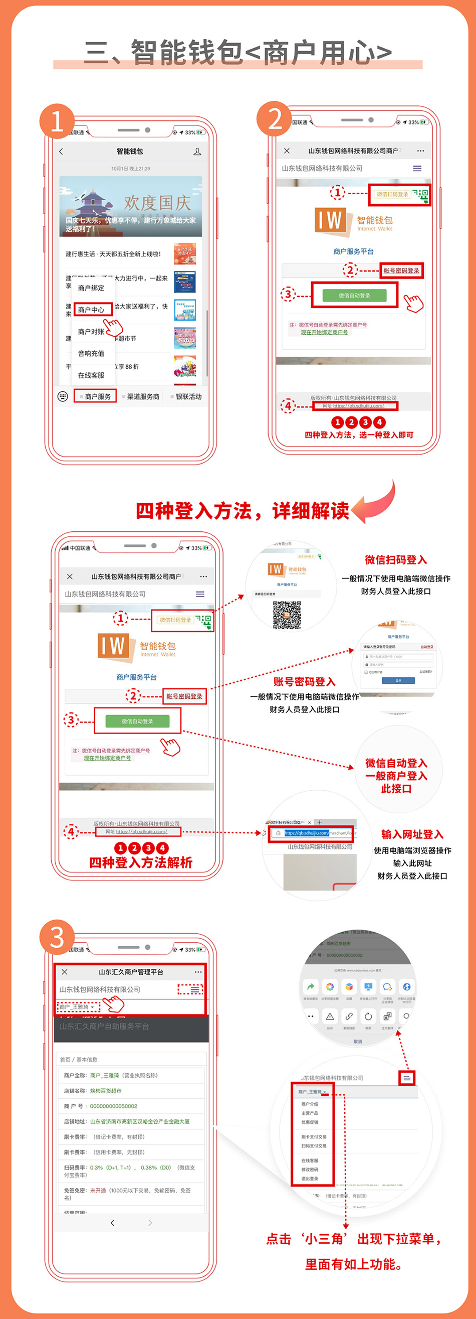 智能钱包对账平台分为电脑端和公众平台两种登录方式,,,使用条码付直联商户号登录。。